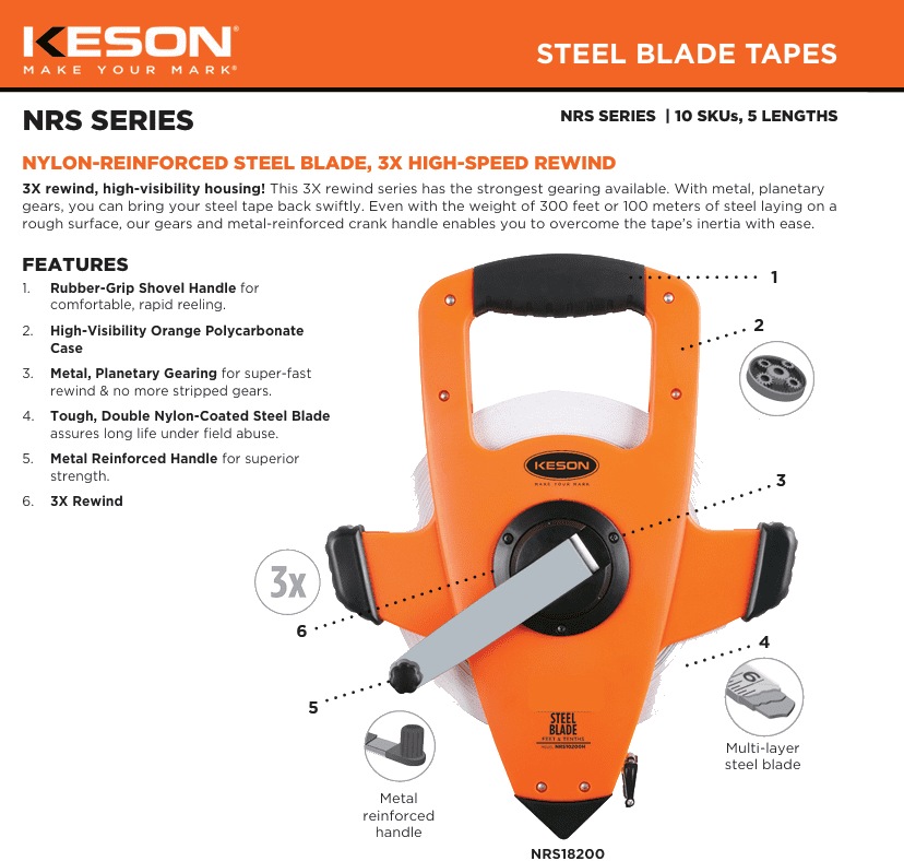 NYLON-REINFORCED STEEL BLADE, 3X HIGH-SPEED REWIND