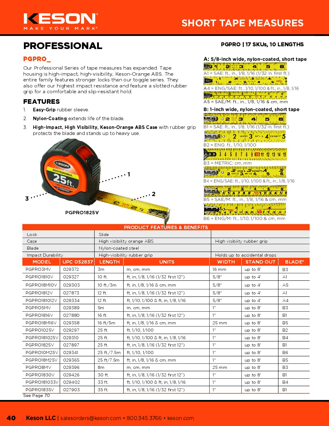 The Pro Series tape measures offer a high-impact, high-visibility, Keson-Orange ABS housing. The entire family feature stronger locks than our toggle series. They also offer our highest impact resistance and feature rubber grip for a comfortable and slip-resistant hold.